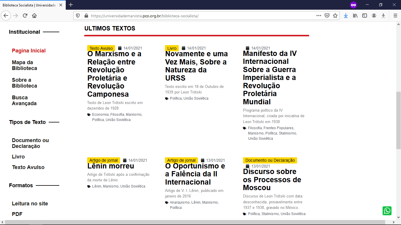 “Textos dos maiores dirigentes e militantes que a classe operária já produziu, como Karl Marx, Friedrich Engels, Vladimir Lênin, Rosa Luxemburgo e Leon Trótski, dentre outros. Muitos dos materiais são traduzidos pela própria equipe da Universidade Marxista do PCO, sendo publicados, portanto, de forma inédita em língua portuguesa e não encontrados em nenhum outro local na Internet.”